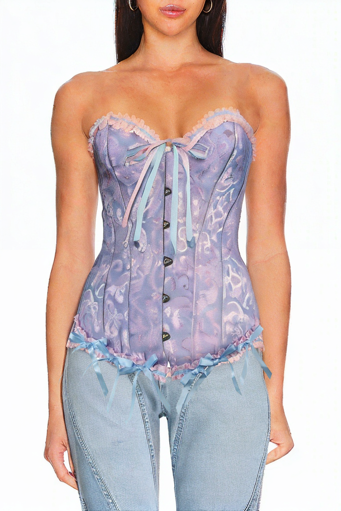 Product Description Feel the romance in our women’s corset tops. Featuring a charming bow front and a flattering sweetheart neckline, this delightful corset is perfect for adding a touch of elegance to any outfit. Product Features Lace Ruffle Trim The delicate lace ruffles add a feminine touch, enhancing the overall charm and sophistication of