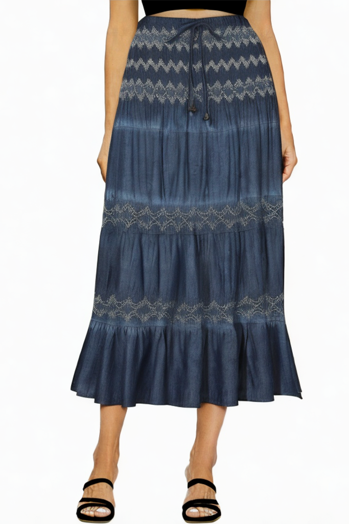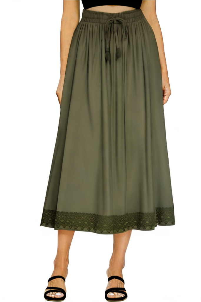 Product Description Show off your effortless style in our bohemian maxi skirt. Combining comfort and elegance, this versatile piece is perfect for sunny days and beach outings. Product Features Elastic Waistband The elastic waistband ensures a comfortable fit and can be easily adjusted for all-day wear. A-Line Silhouette The flowing A-line shape flatters all