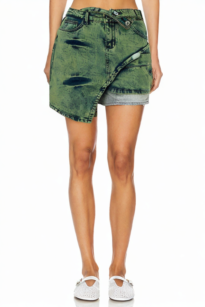 Product Description Step out in style with our Irregular Design Splicing Denim Skirt, crafted for the fashion-forward woman. This spring-ready skirt features a unique green hue and double-button detail, adding a touch of edgy sophistication to your wardrobe. Product Features Irregular Design The asymmetric cut offers a modern twist on classic denim, making this