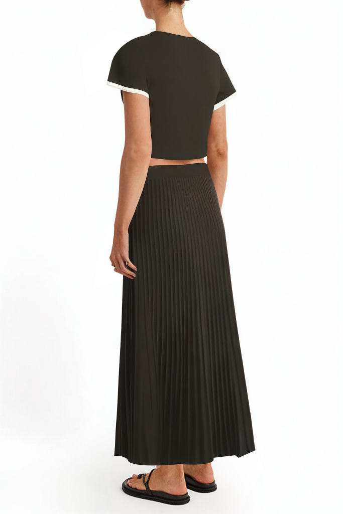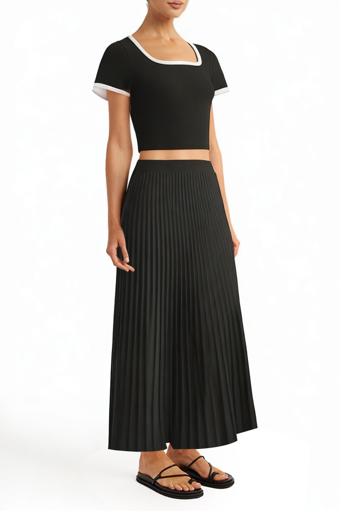 The skirt features chic pleats that add movement and a flattering shape, creating a fun, feminine silhouette.
