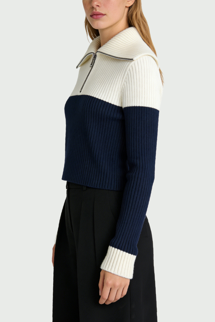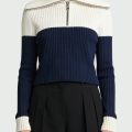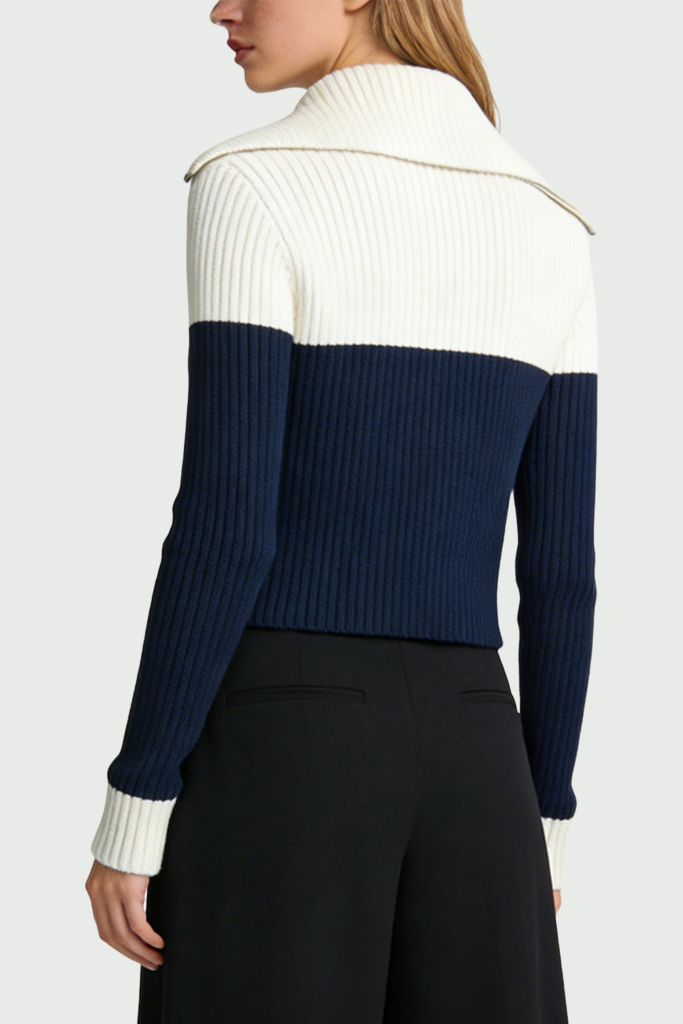 Women’s Lapel Half-Zip Color-Block Stripe Sweater